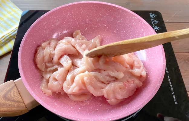 Куриное филе разрежьте вдоль на три слайса, затем нарежьте тонкой соломкой. Разогрейте сковороду с оливковым маслом, выложите куриное мясо и обжарьте до полуготовности.