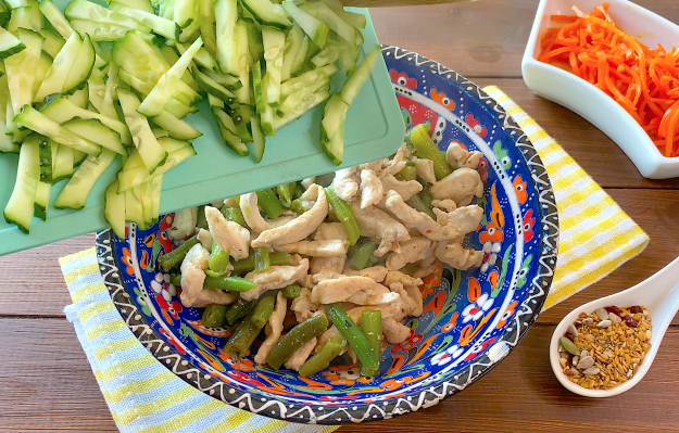 Выложите курицу с фасолью в салатник. Сразу добавьте нарезанный соломкой огурец.