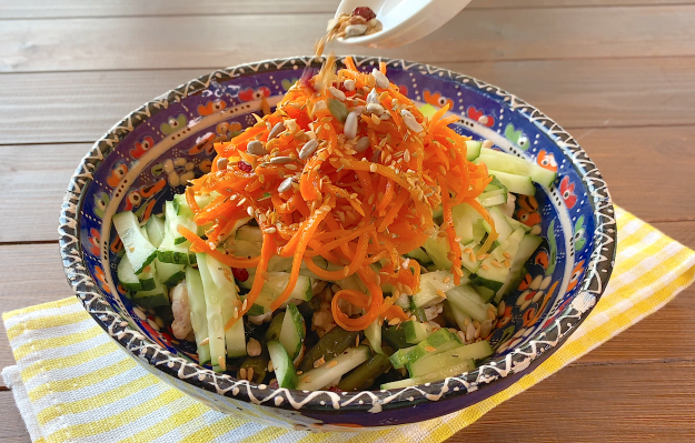 Выложите морковь по-корейски, по желанию посыпьте смесью семечек для салата и перемешайте.