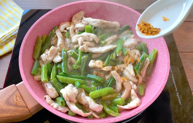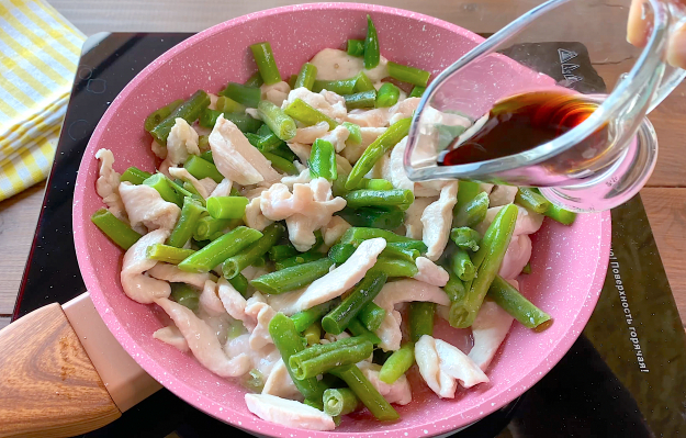 Добавьте стручковую фасоль и обжарьте минут 5-7 на среднем огне. Влейте соевый соус.