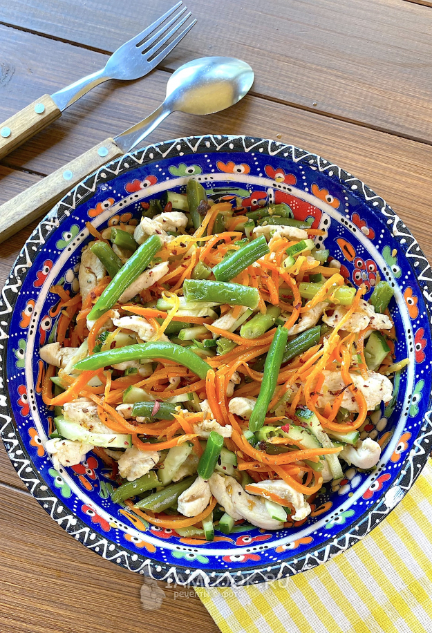 Теплый салат с курицей и фасолью стручковой готов, можно подавать на стол.