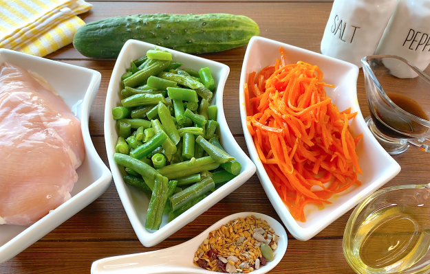Для начала подготовьте все необходимые продукты для теплого салата с курицей и стручковой фасолью.