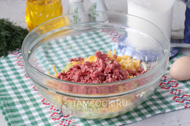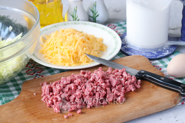 За это время мелко нарезать колбасу и натереть твёрдый сыр.