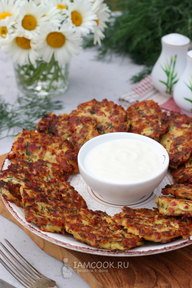 Готовые кабачковые оладьи с колбасой и сыром подать к столу со сметаной.
