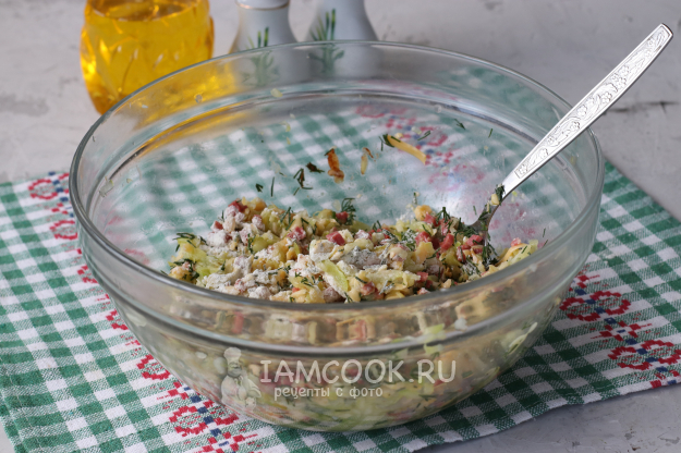 Слить с кабачка выделившийся сок, добавить к мякоти сыр и колбасу.