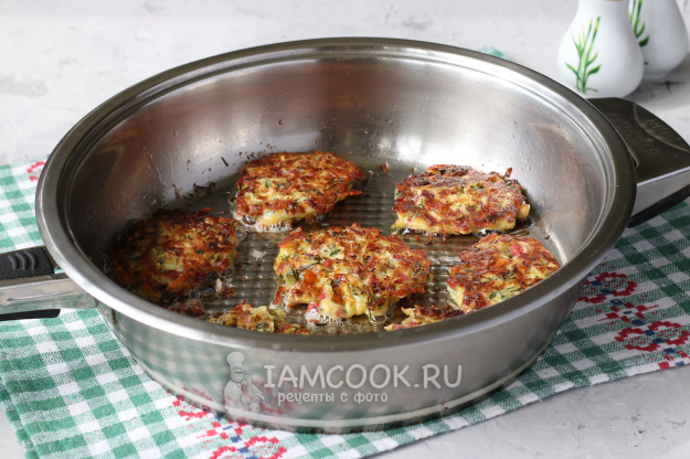 Для приготовления кабачковых оладий с колбасой и сыром подготовить из списка необходимые ингредиенты.