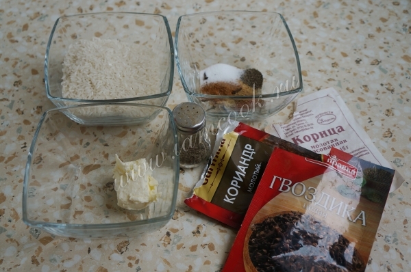 На фото ингредиенты для приготовления пряного риса: специи (гвоздика, перец, кориандр, корица), сливочное масло, длинный рис.