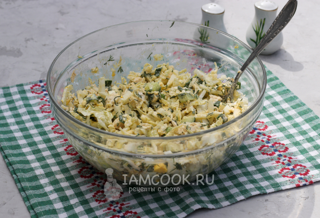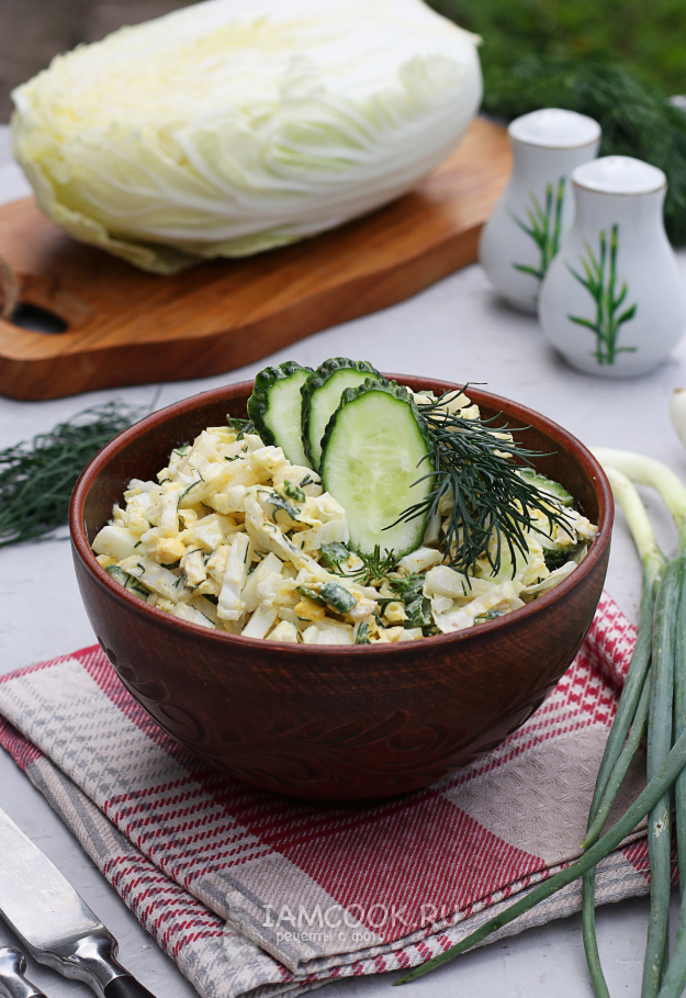 Подать салат с курицей, пекинской капустой, огурцом и яйцом к столу.