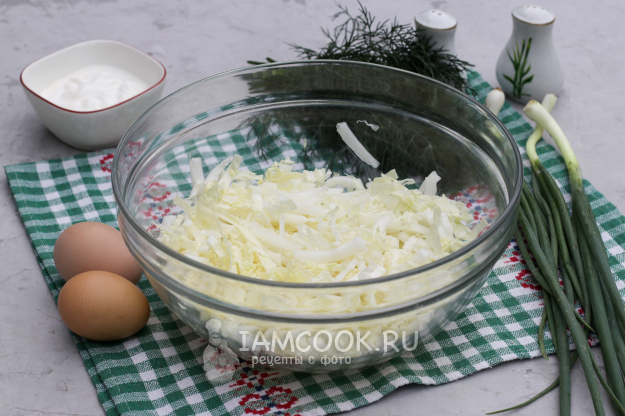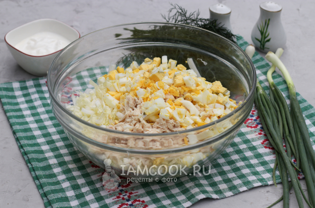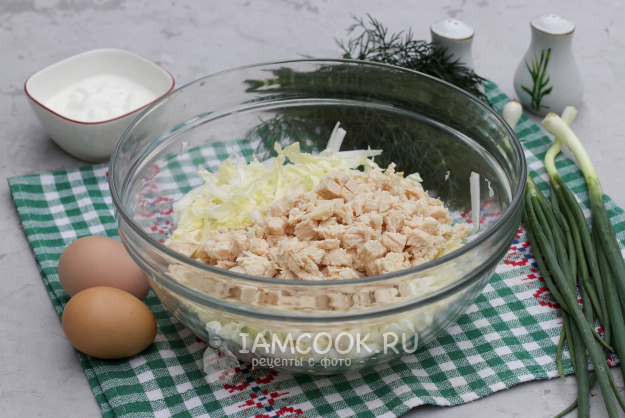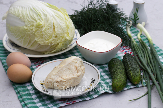Для приготовления салата с курицей, пекинской капустой, огурцом и яйцом подготовить из списка необходимые ингредиенты.