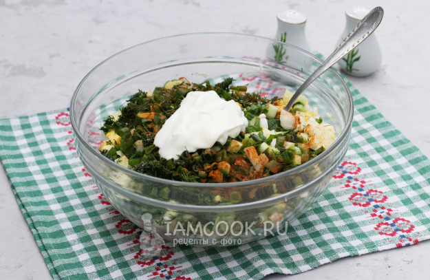Мелко нарезать укроп и зелёный лук, добавить их в салатник, посолить и поперчить. Добавить в салат сметану.