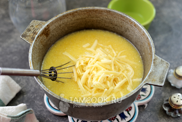 Когда крупа слегка набухнет, сразу же всыпьте натертый сыр, еще раз перемешайте венчиком, посолите и поперчите по вкусу.