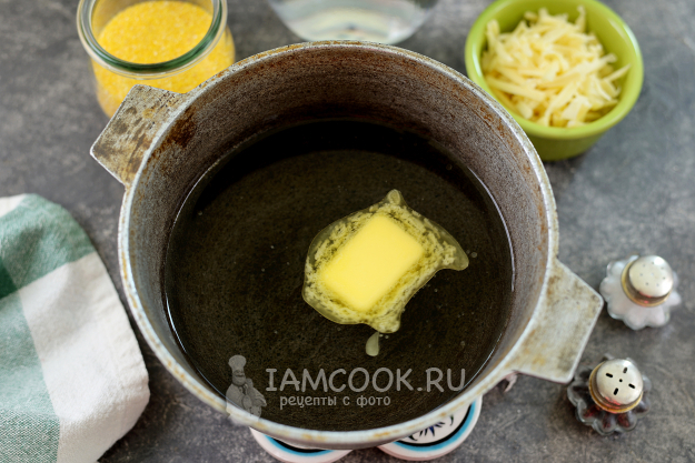 Влейте в казанок воду, доведите до кипения, положите кусочек сливочного масла.