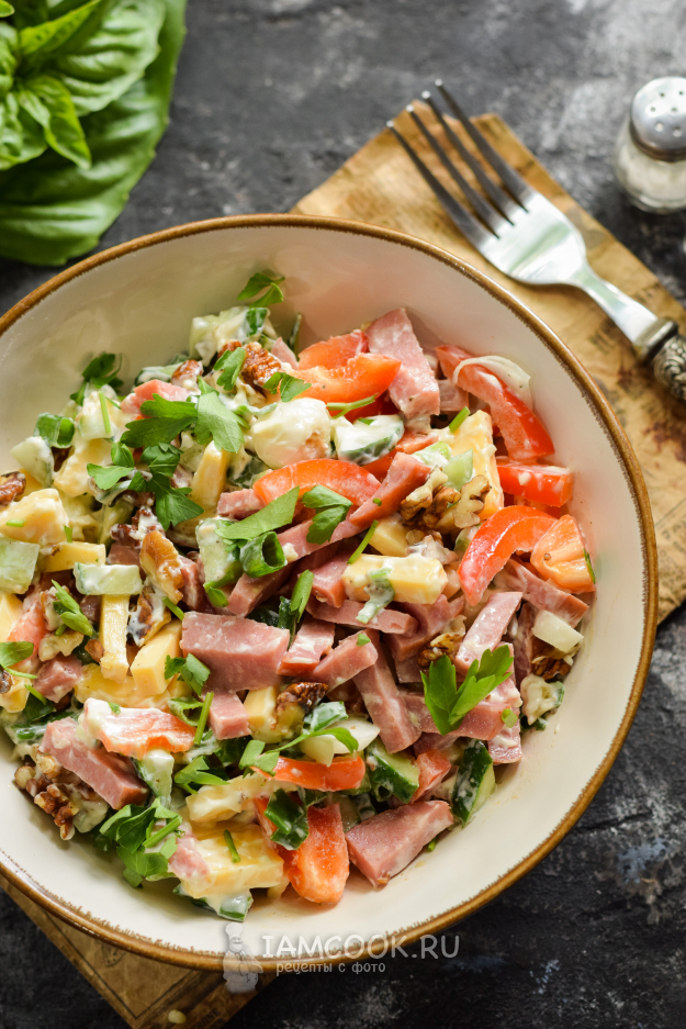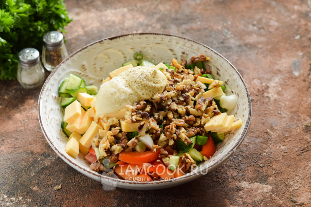 Сложить все подготовленные ингредиенты в салатник, добавить майонез, соль и молотый перец по вкусу. Перемешать всё и снять пробу, отрегулировать на соль и подавать салат с грецкими орехами и колбасой к столу.
