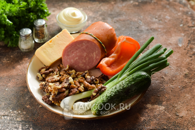 Подготовить все продукты для салата с грецкими орехами и колбасой.