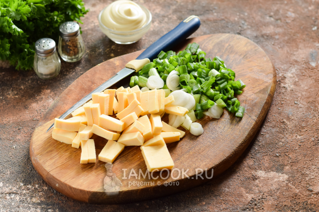 Твердый сыр нарезать полосками, зеленый лук ополоснуть и просушить. Нарезать лук мелко.