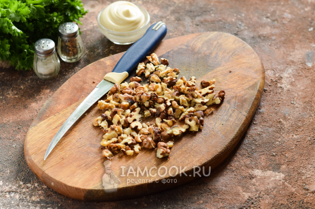 Грецкие орехи перебрать и нарезать небольшими кусочками. Также орехи можно измельчить в блендере.