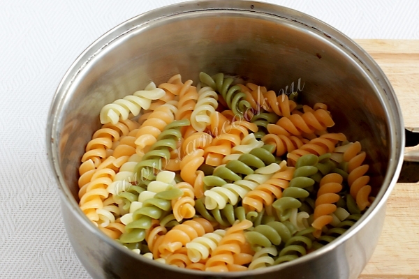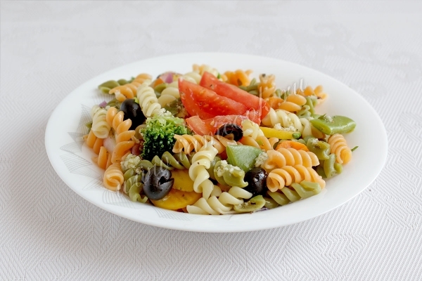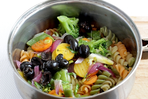 Соединить фузилли и все овощи, полить заправкой, перемешать.
