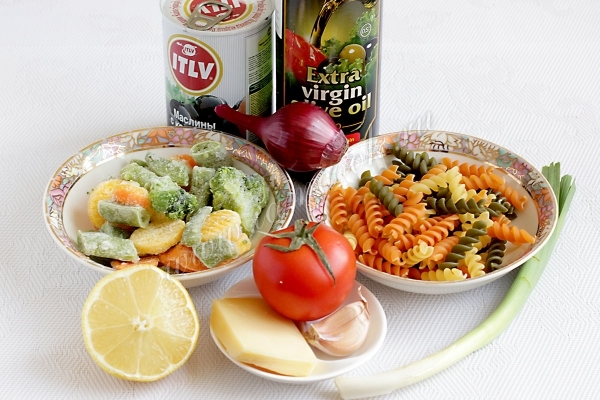 Этот простой салат сможет приготовить любой мужчина для любимой к празднику влюбленных или 8 Марта, чтобы порадовать свою половинку вниманием и заботой. Согласитесь, интересно попробовать творение своего мужа или молодого человека. Салат совсем простой и получается необычным за счет пикантной заправки, и очень ярким за счет разноцветных макаронных изделий. В салат можно добавить любую зелень по сезону. Смесь замороженных овощей с успехом заменяется свежей морковью и капустой( брокколи, цветной), которые нужно предварительно слегка обжарить или пробланшировать.