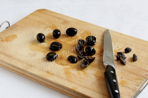Из маслин нужно вытащить косточки. Это делается простым надавливанием ножа. Не берите маслины без косточек, у них совершенно вымоченный вкус.