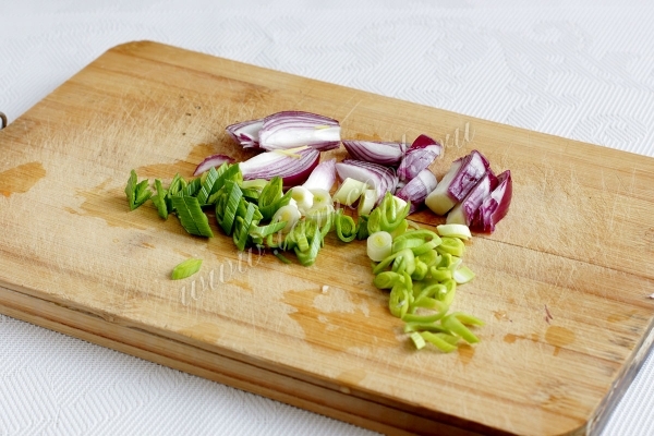 Тем временем нарезаем фиолетовый лук ломтиками вдоль, а зеленый чеснок режем мелко. Если нет по сезону такого чеснока, то возьмите зубчик обычного.