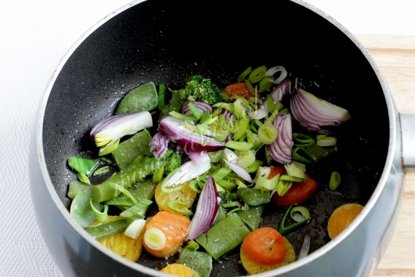 Замороженные овощи нужно слегка приготовить. Для этого их нужно выложить в сотейник и налить туда пару ложек воды и ложку масла. Помешивая, довести до полуготовности на среднем огне. На это уйдет не больше 5 минут. Добавить нарезанные лук и чеснок, слегка посолить и поперчить. Лук должен стать слегка мягким, не нужно его сильно зажаривать.