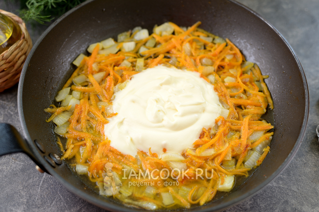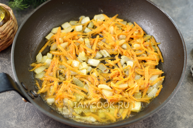 Добавьте натертую морковь и жарьте еще пару минут. Когда овощи станут мягкими, влейте белое вино, прогрейте его около минуты на сильном огне.