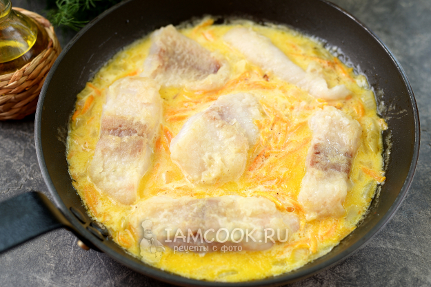 Сделайте в маринаде лунки, выложите в них рыбу и готовьте на тихом огне под крышкой минуты 3, посолите и поперчите по вкусу. Мука на рыбе поможет соусу хорошо загустеть.