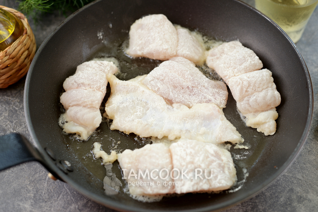 Разогрейте в сковороде растительное масло, нарежьте филе на куски, запанируйте рыбу в муке, обжарьте ее быстро с обеих сторон до румяной корочки.