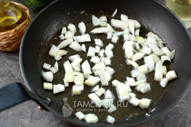 Рыбу снимите со сковороды, а в это же масло выложите нарезанный кубиком репчатый лук, обжарьте его пару минут.