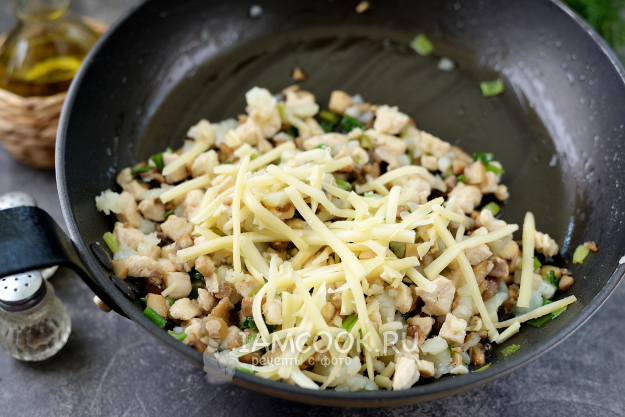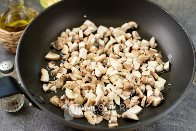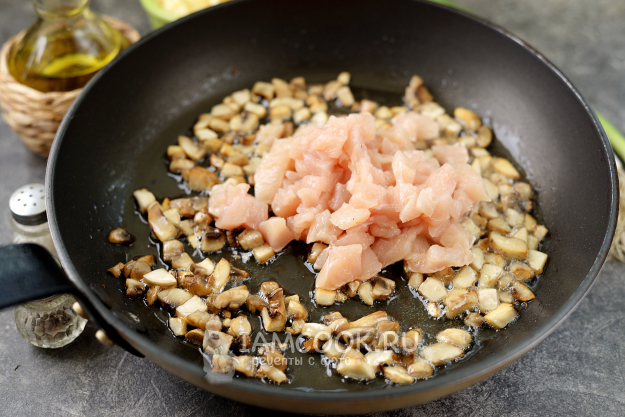 Когда грибы пустят сок, добавьте нарезанное таким же мелким кубиком филе. Готовьте все вместе еще минут 5.