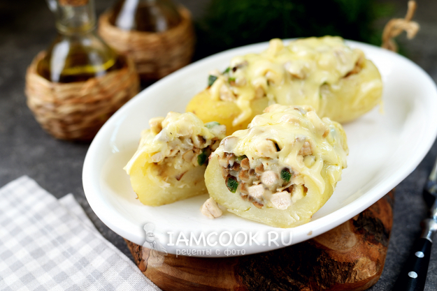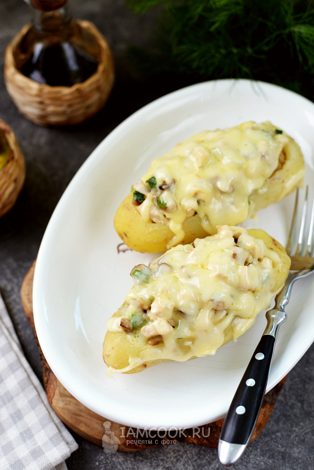 Плотно нафаршируйте лодочки начинкой, посыпьте оставшимся сыром, отправьте в духовку под верхний нагрев или гриль еще на 5-7 минут, чтобы сыр расплавился, а картофель с начинкой хорошо прогрелся.