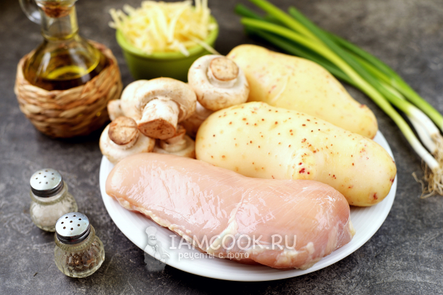 Возьмите продукты для приготовления крошки-картошки с курицей и грибами. Картофель у нас сейчас только молодой, поэтому кожуру на нем желательно почистить, так как она горьковата. Помойте курицу, грибы и лук, обсушите.