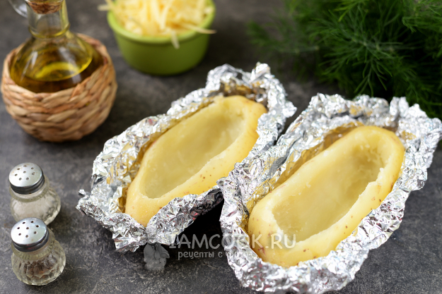 Готовый картофель слегка остудите, разверните фольгу, но не снимайте ее пока. Выскоблите чайной ложкой всю мякоть, лодочки слегка посолите и поперчите.