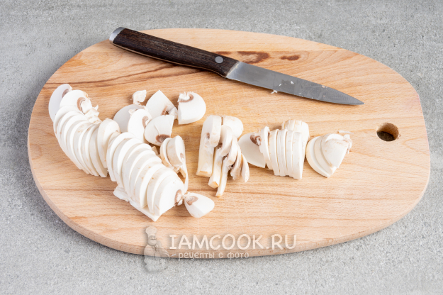 Приступаем! Нарезаем помытые шампиньоны на пластинки.