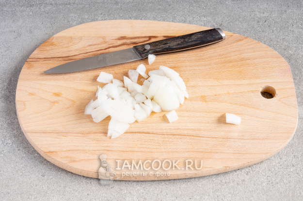 Режем меленько репчатый лук (хотя крупно тоже, думаю, подойдёт).