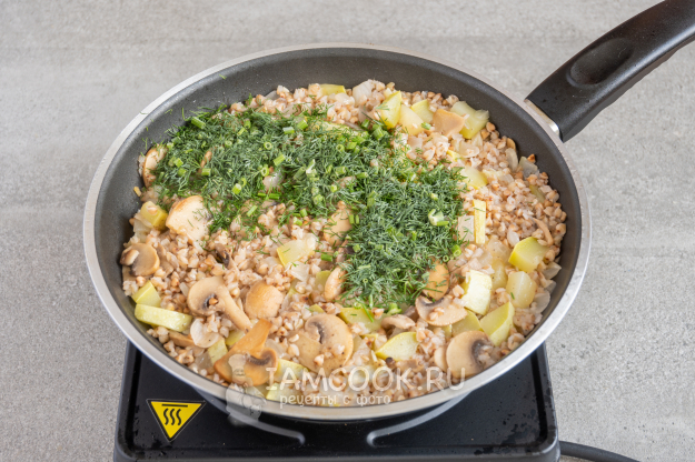 После чего сразу добавляем промытую гречку и перемешиваем всё содержимое сковороды, чтобы гречка и овощи подружились)))