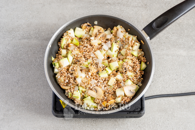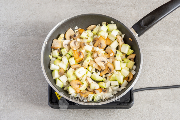 Теперь очередь кабачков. Их нужно жарить с грибами и луком буквально 3 минутки. А затем добавить чеснок и всё перемешать.