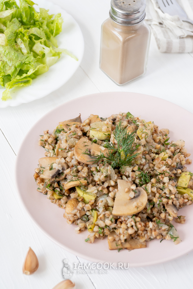 Гречка с шампиньонами и кабачками готова! Подавать можно с салатиком. А также как дополнение к чему-то "потяжелее" - в виде мяса или рыбы.