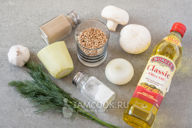 Чтобы приготовить гречку с грибами и кабачками на сковороде, подготовьте все необходимые компоненты по списку ингредиентов.