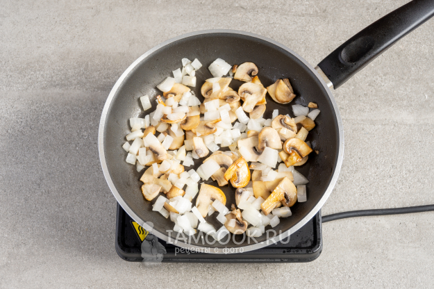 Далее кладём лук и жарим ещё несколько минут - до прозрачности лука.
