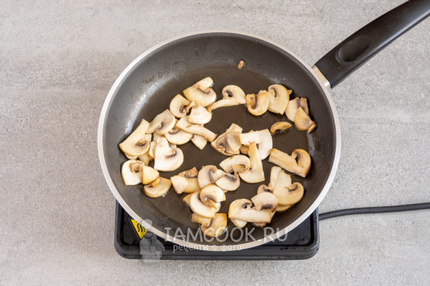 Разогреваем сковороду. Вливаем в неё растительное масло и кладём грибы. Жарим грибы, периодически помешивая, на среднем огне до зарумянивания. Крышкой не накрывайте.