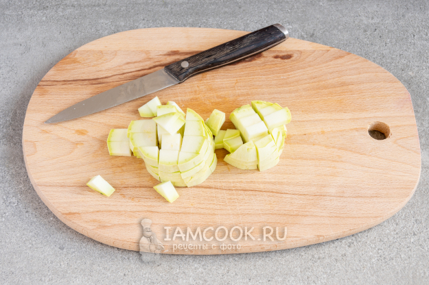 Кабачки нарезаем кубиками, не слишком мелкими. Если у вас молодые кабачки, то кожуру можете не срезать.