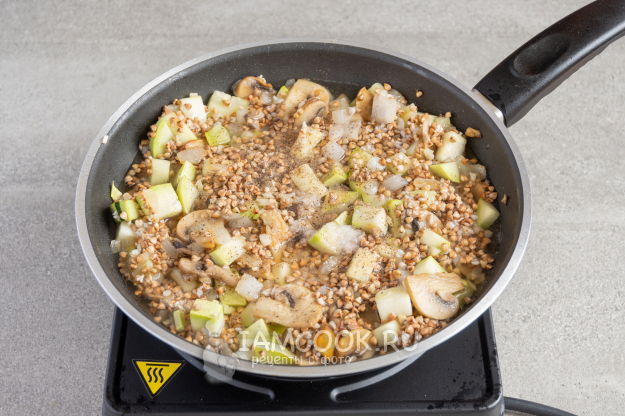 Вливаем воду, всыпаем перец и соль по вкусу. Ещё раз всё перемешиваем, делаем маленький огонь, накрываем крышкой и готовим гречку с грибами и кабачками на сковороде минут 30-35. Гречка впитает в себя водичку и станет мягкой и рассыпчатой.