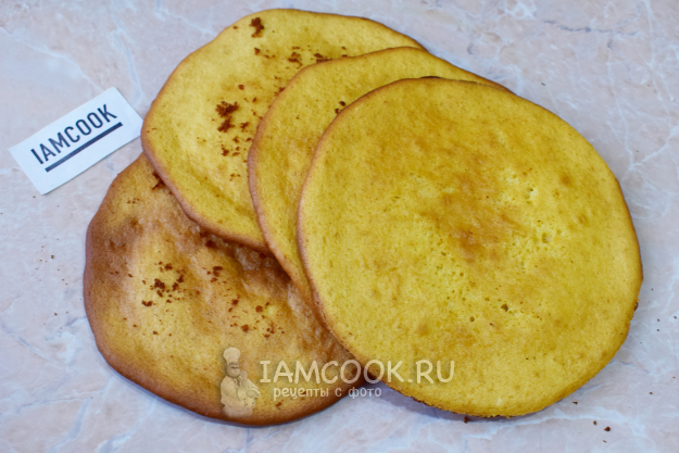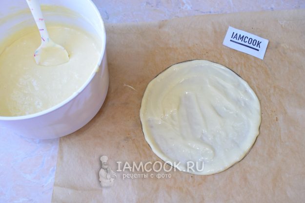 Готовое тесто должно получиться однородным, без комочков муки. На листе пергамента нарисуйте круг необходимого диаметра. Чем шире будут коржи, тем меньше их получится, соответственно и торт будет ниже. Диаметр коржей может быть от 18 до 26 см. Лист пергамента переверните и выложите немного теста. Распределите тесто тонким слоем по контуру круга. Поставьте корж в духовку, предварительно разогретую до 180 градусов, на 3-5 минут. Коржи пекутся очень быстро.