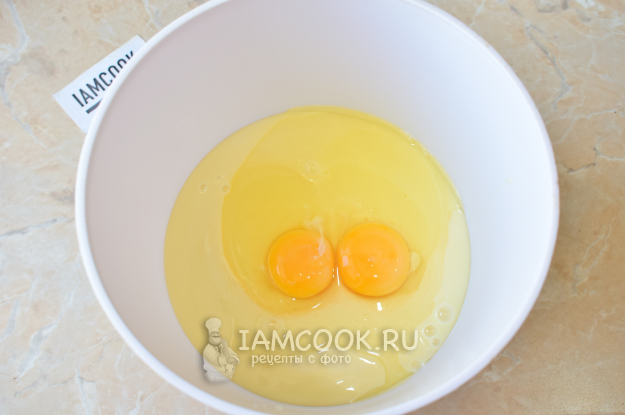 Для приготовления коржей налейте в чашу сгущенку и добавьте яйца. Немного смешайте все венчиком.