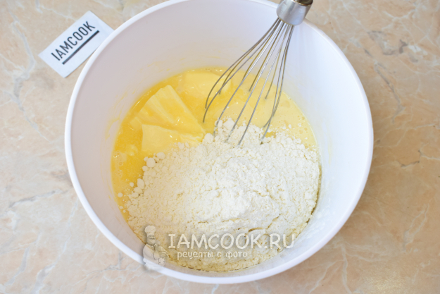 Следом добавьте мягкое сливочное масло. Муку с содой просейте через сито, чтобы насытить кислородом. Подсыпайте муку с содой в чашу и замешивайте тесто.