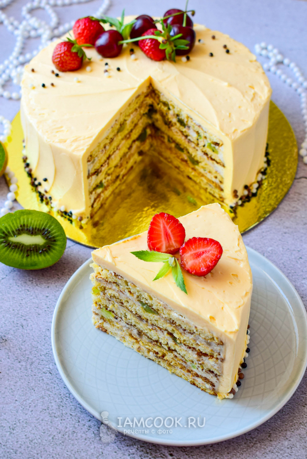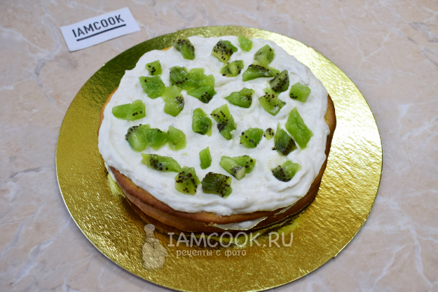 Каждый корж немного смазывайте банановым кремом и выкладывайте нарезанный киви.