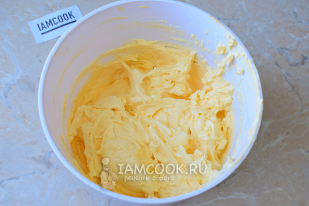 Для финишного крема взбейте мягкое сливочное масло с сахарной пудрой и вмешайте творожный сыр. Для цвета можно добавить любой пищевой краситель. Я добавила каплю оранжевого.