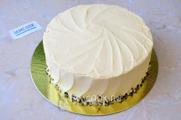 Снимите с торта кольцо и выровняйте торт сверху и по бокам подготовленным кремом. Украсьте торт на свой вкус.