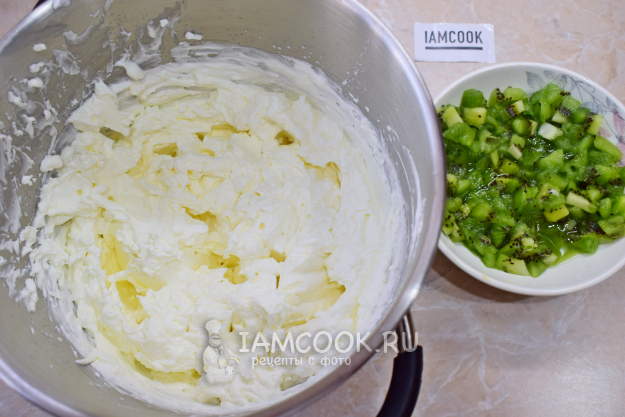 Киви очистите и нарежьте на маленькие кусочки. Для крема взбейте сливки с сахарной пудрой и творожным сыром. Крем получается достаточно плотным.
